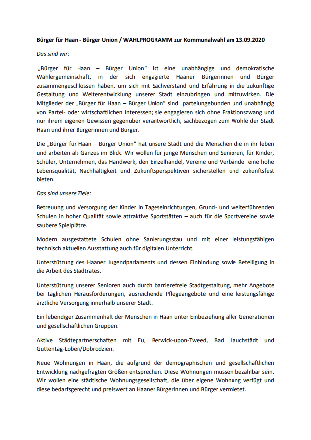 Die Wählergemeinschaft „Bürger für Haan – Bürger Union“ steht u.a. für: