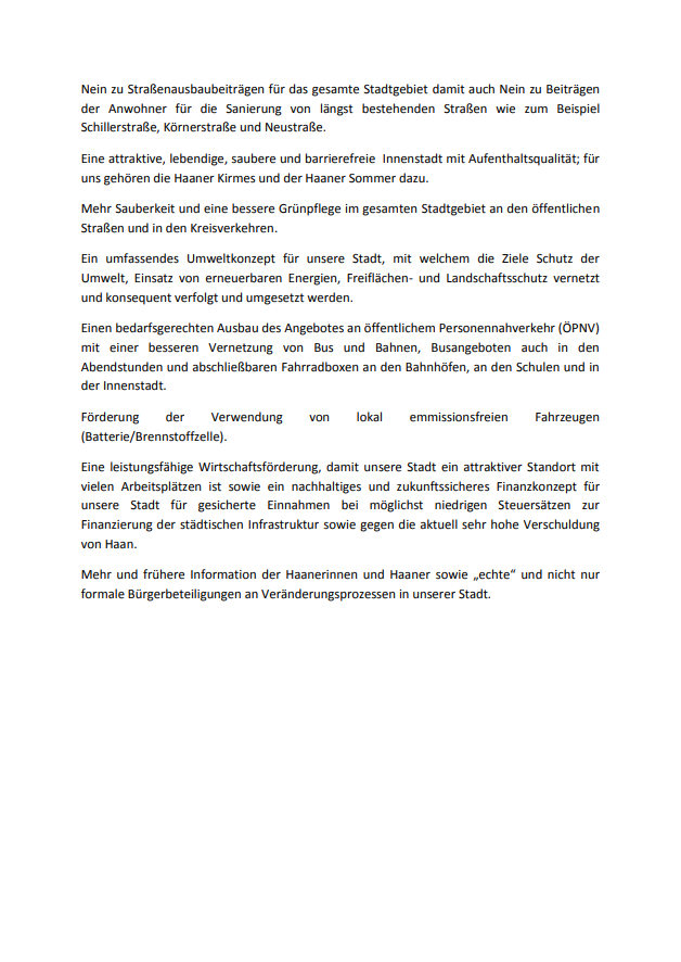 Noch unentschieden? Beantworten sie einige Fragen beim Lokal-O-Mat: https://haan.lokal-o-mat.de/de